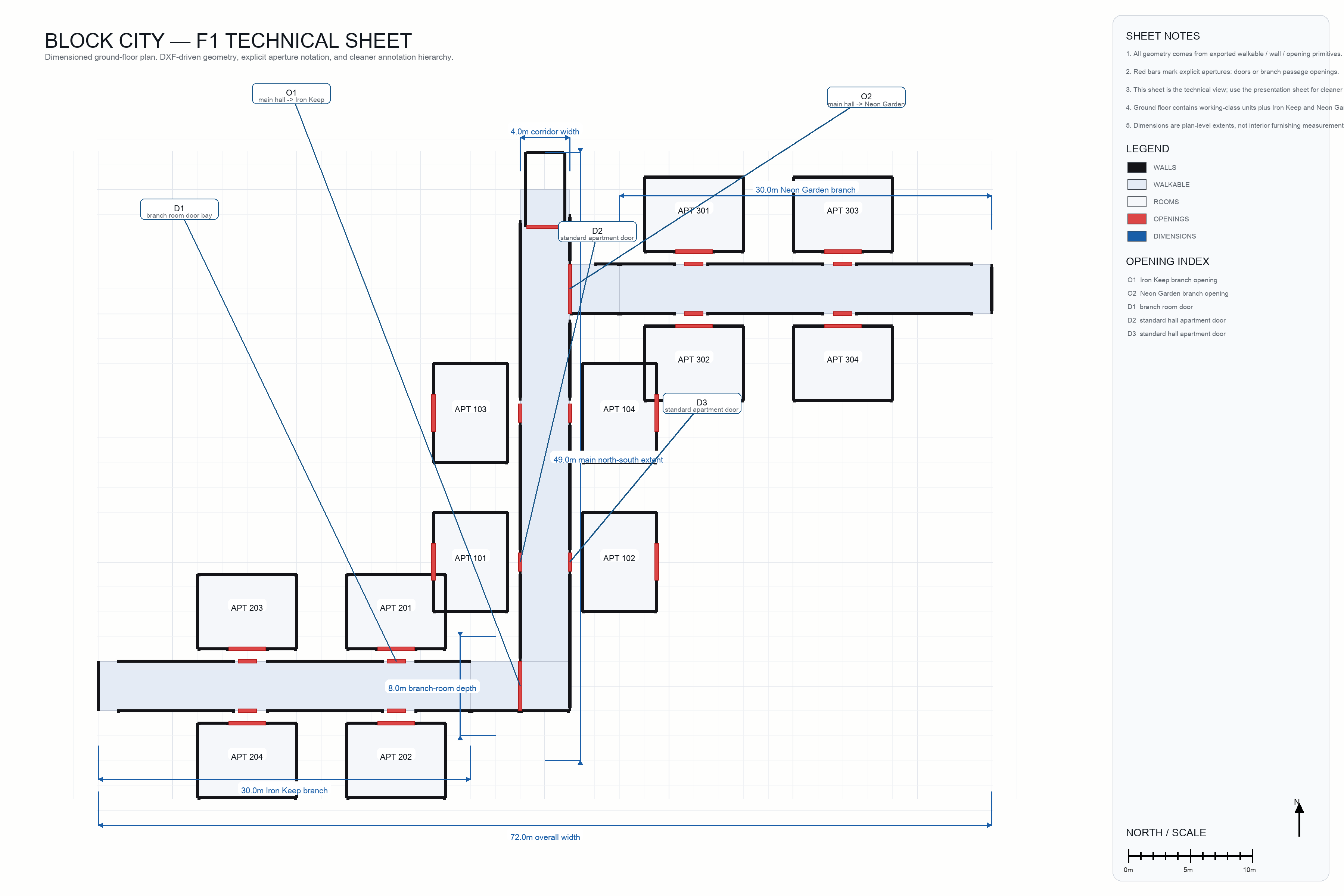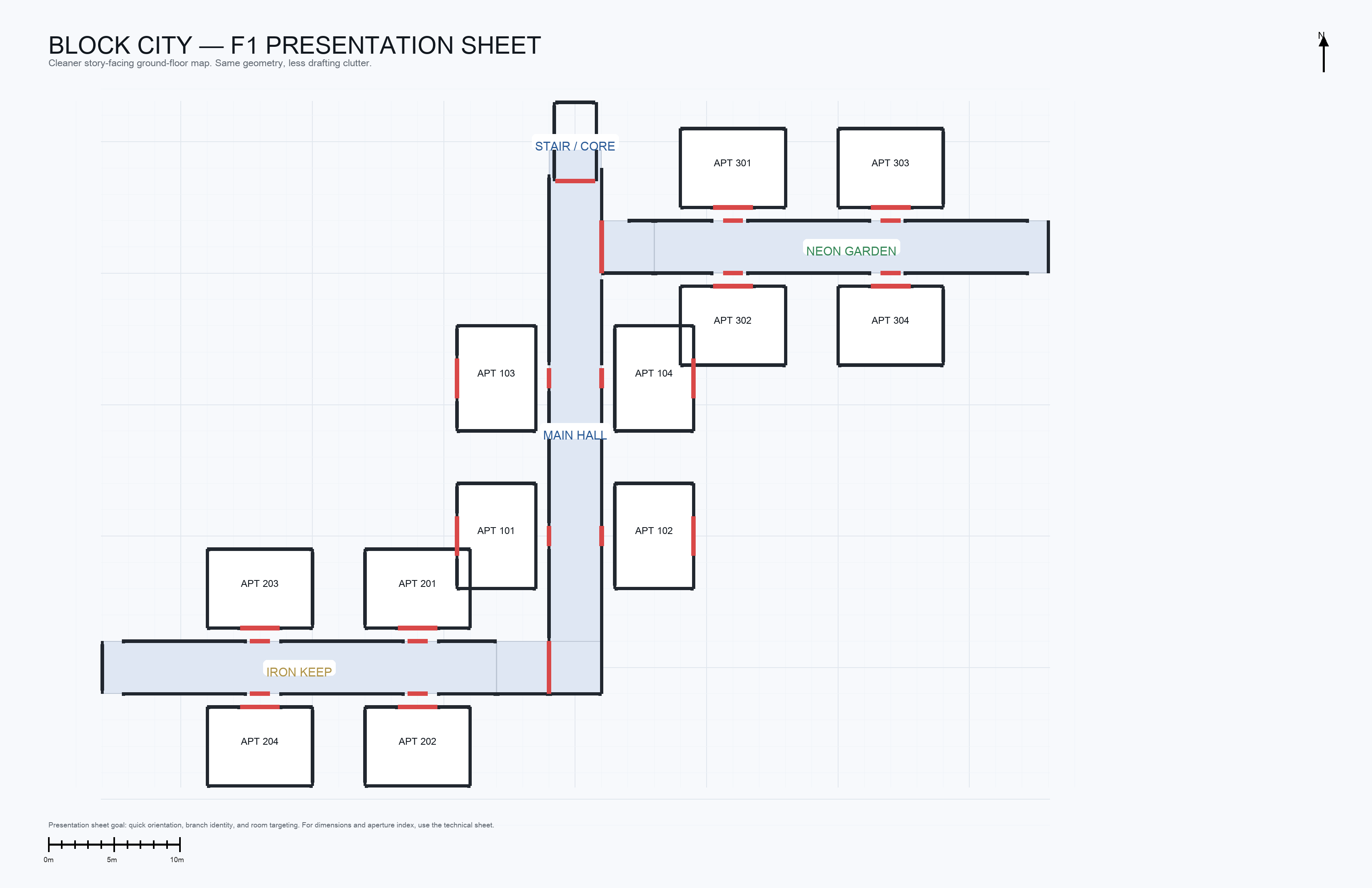 block-city web layout from the repo code. Floors 2–5 and -1 to -4 all reuse the same basic corridor template; the ground floor is the special one with the two side branches: Iron Keep and Neon Garden.